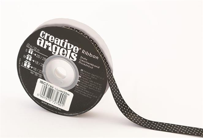 Szatén szalag, 15 mm x 22 m, fekete fehér pötyökkel